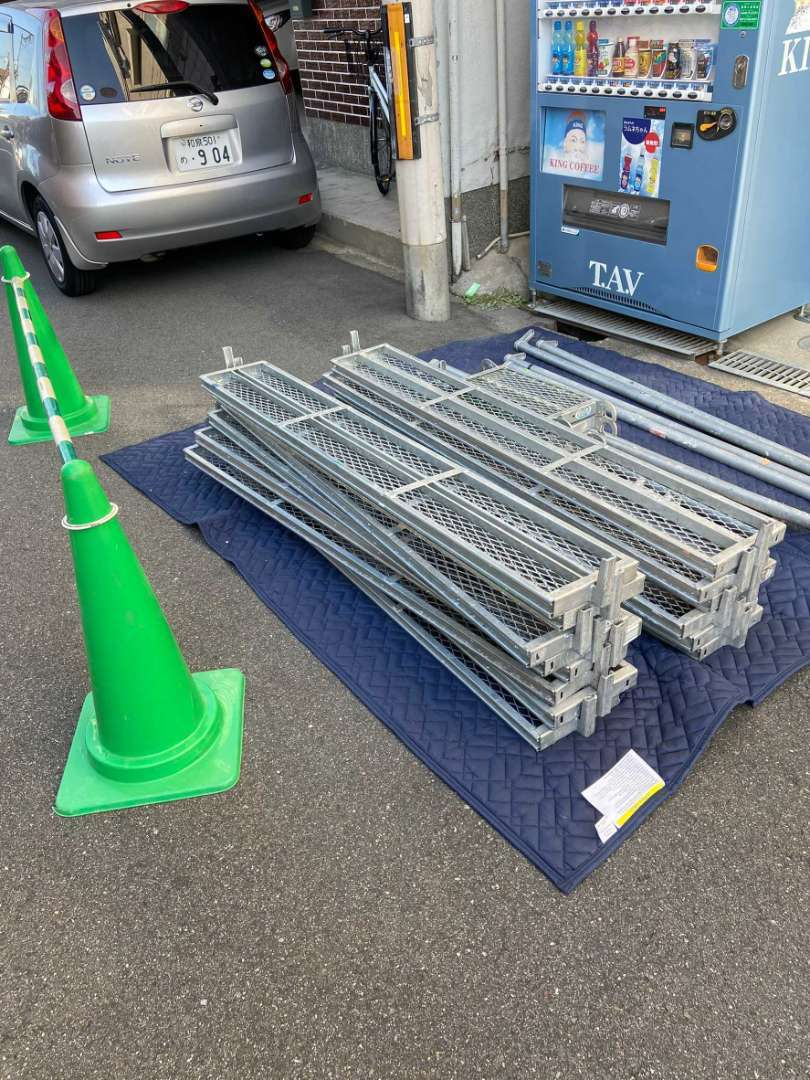 ハナマル商会ではたとえアスファルトの道路の上でもしっかりと養生を行い足場工事の施工を行っております。